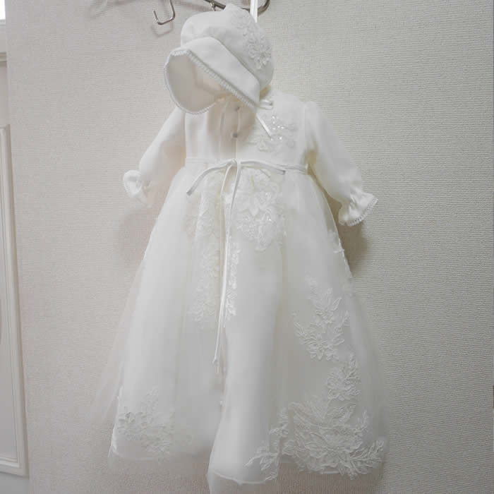 ドレス&帽子セットはシンプルなデザインながらレースをあしらう事で上品な仕上がり。