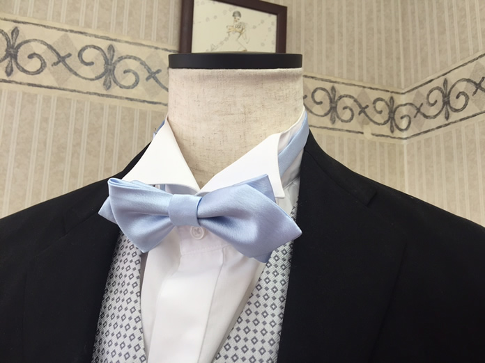お客様へのお知らせ・ブログ花嫁様のイメージチェンジ用にサッシュベルトをお買い上げいただいたお客様のご要望でお揃いの生地でご新郎様の蝶ネクタイをお作りしました。