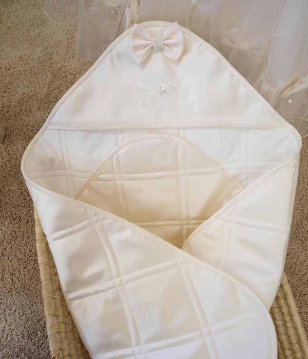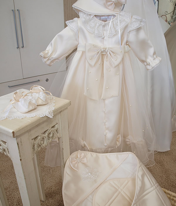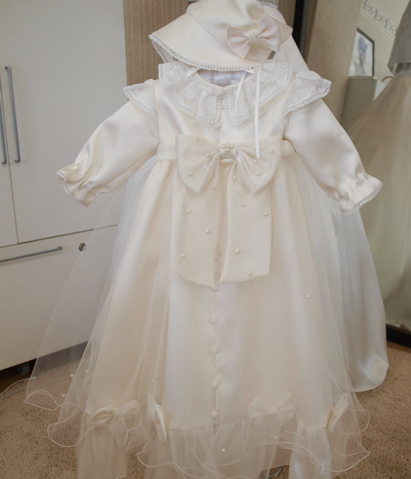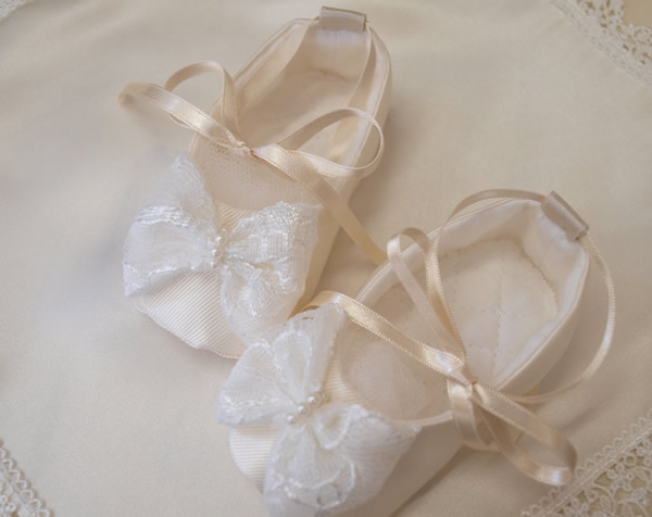 ママのドレスに付いていたレースやリボンをアレンジしたラブリーなベビードレス。