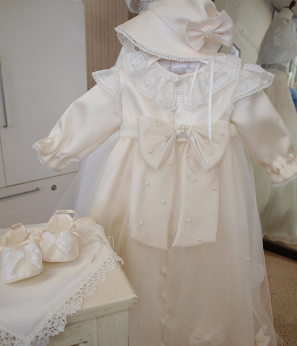 ママのドレスに付いていたレースやリボンをアレンジしたラブリーなベビードレス。