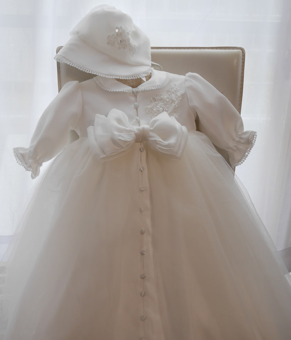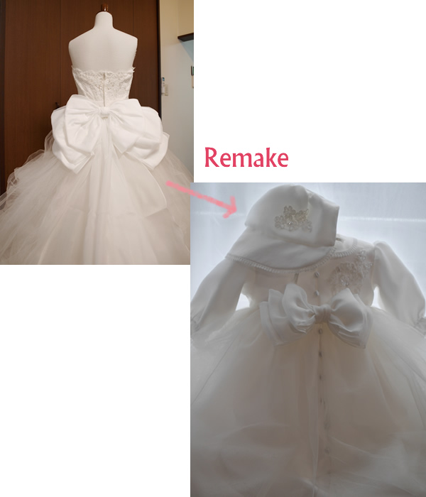 ママのドレスのバックリボンをモチーフにアレンジしたベビードレス。