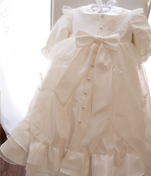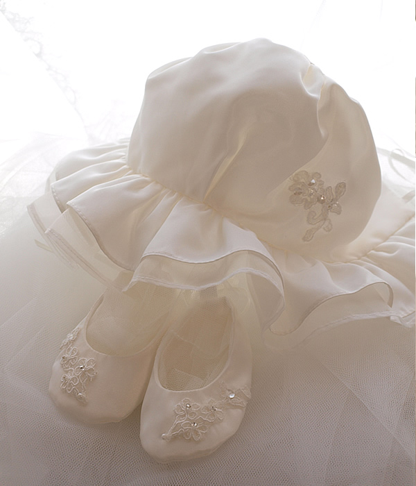 スカートに重なったふんわりオーガンジーのレースや胸元、シューズのレースもウェディングドレスのレースをひとつひとつ取り外して縫い付けた細部にこだわってリメイクしたベビードレスです。