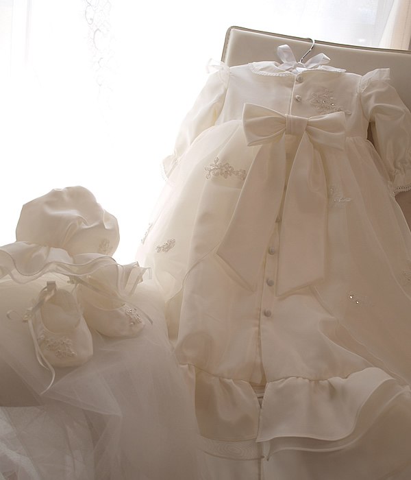 スカートに重なったふんわりオーガンジーのレースや胸元、シューズのレースもウェディングドレスのレースをひとつひとつ取り外して縫い付けた細部にこだわってリメイクしたベビードレスです。