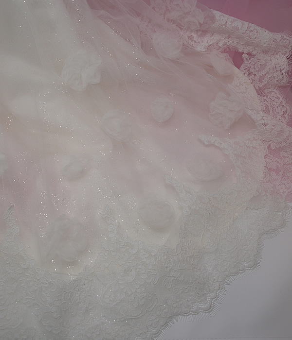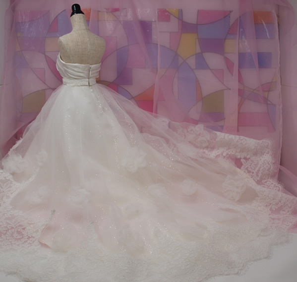 元のウェディングドレスの豪華なレースも同じように裾にぐるりと付けて、お花モチーフも飛ばしています。