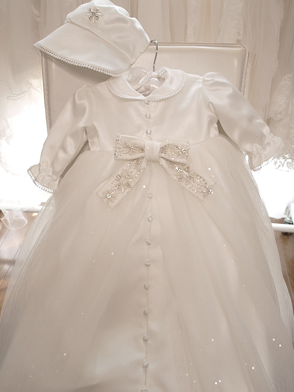 スパンコールが散りばめたチュールがキュートなウェディングドレスをベビードレスにリメイクしました。