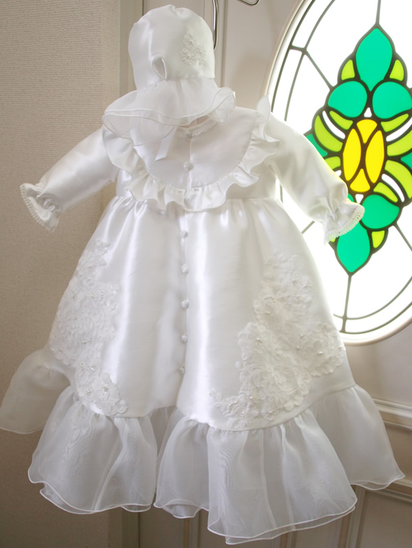 ウェディングドレスの豪華レースを外してベビードレスの裾にアレンジ。