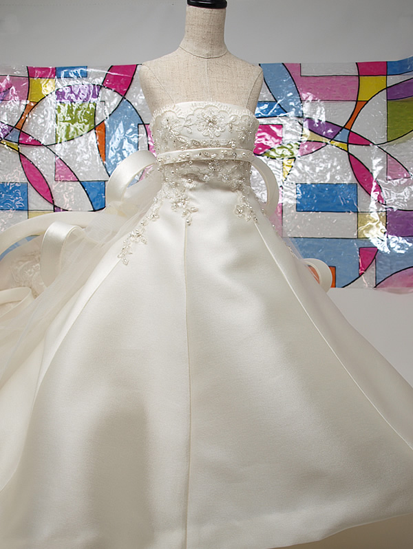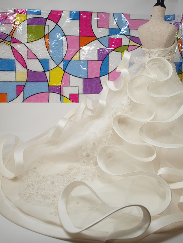 インテリア波打つパイピング使いのトレーンが印象的なウェディングドレスを