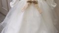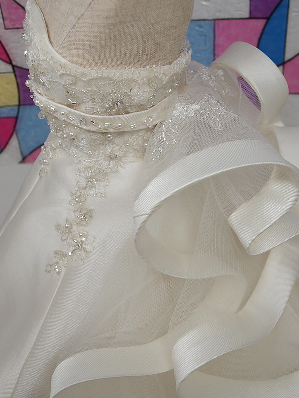 波打つパイピング使いのトレーンが印象的なウェディングドレスを