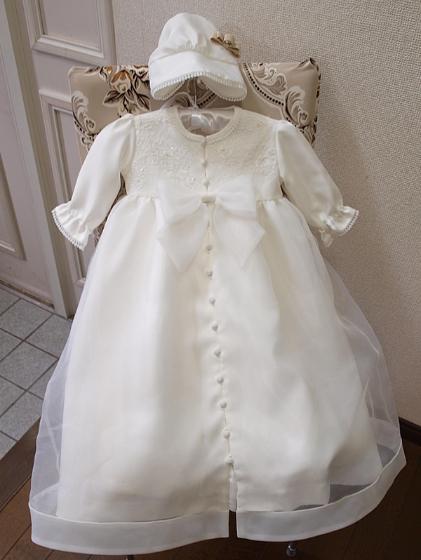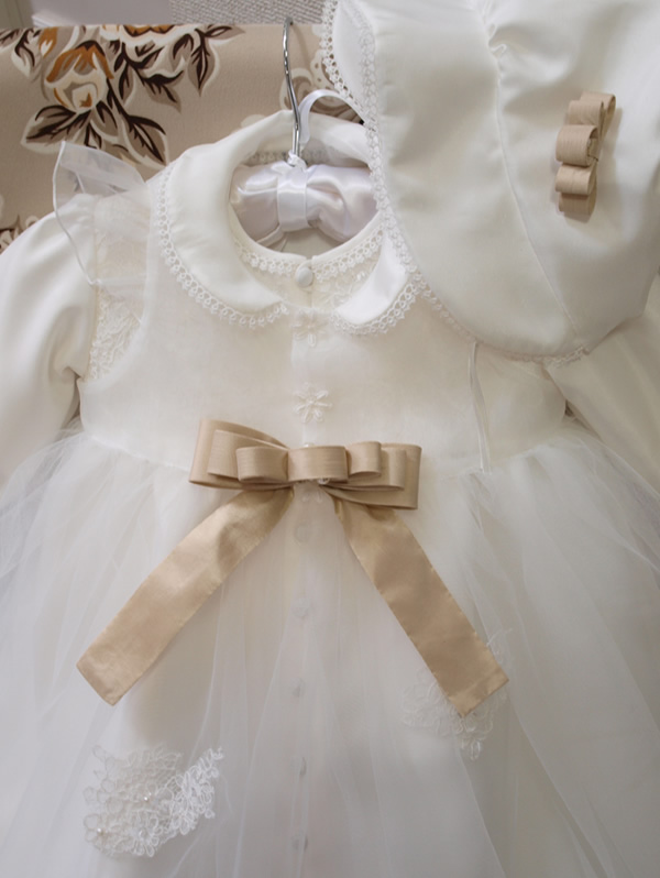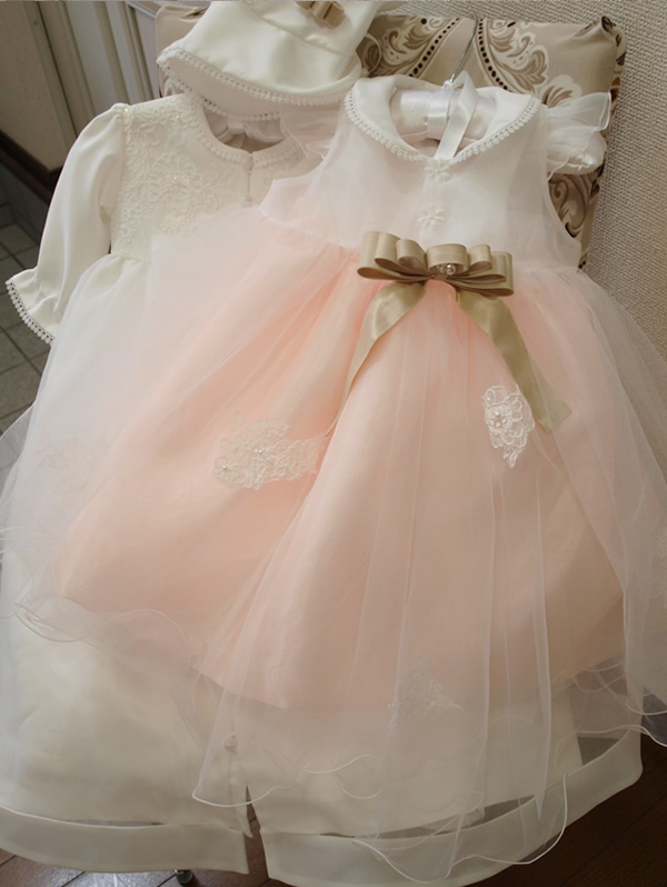ベビードレスはウェディングドレスの太パイピングのモチーフを生かて
