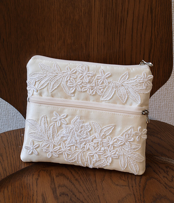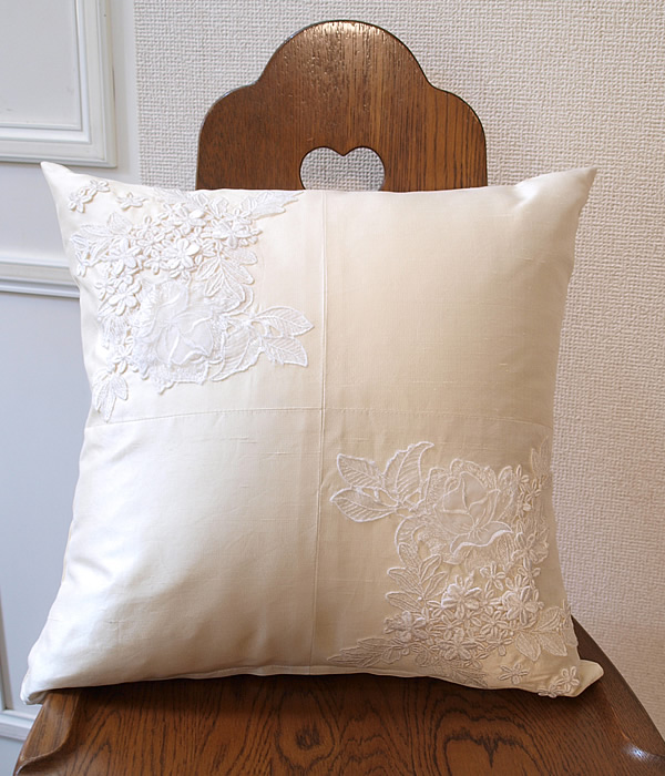 ウェディングドレスをクッションカバーとシンプルなポーチにリメイクしました。