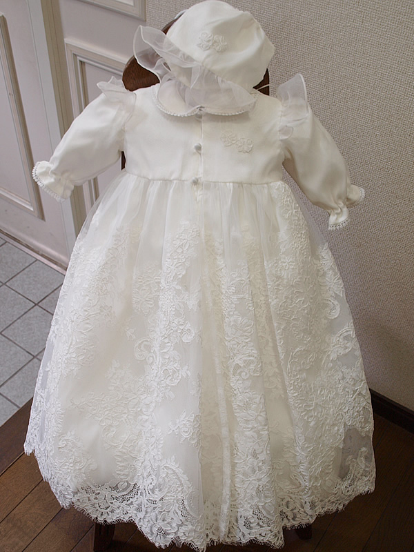 ベビー・子供・出産準備品レース使いが素敵なウェディングドレスをエレガントなベビードレスにリメイクしました。
