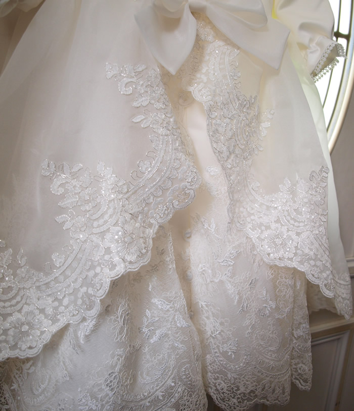 ウェディングドレスのレースをふんだんに使った豪華なセレモニードレス。