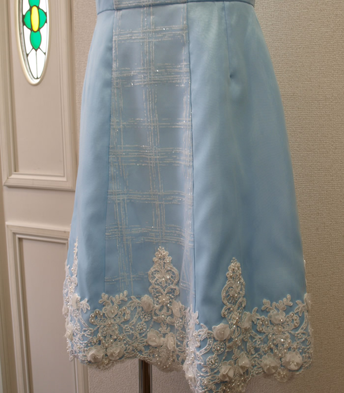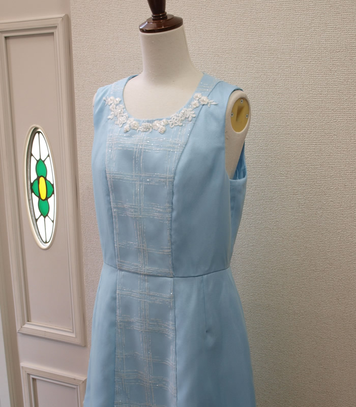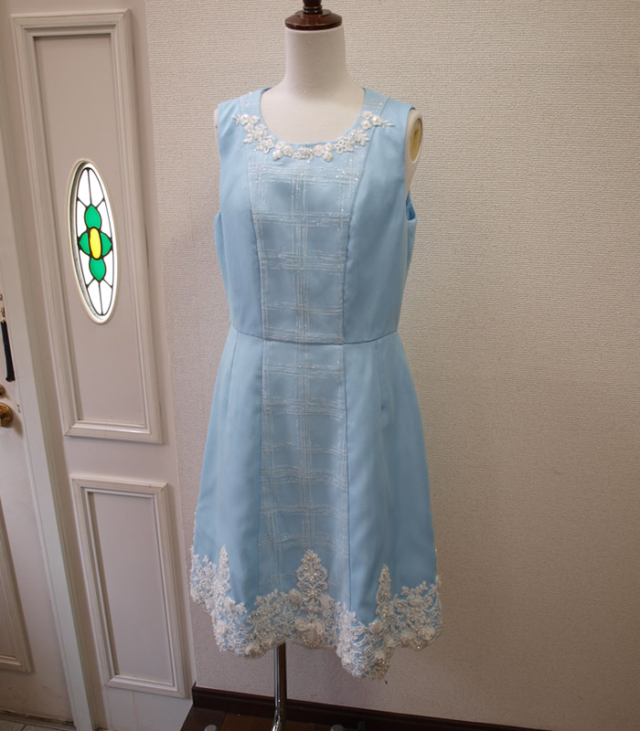 ファッション水色のカラードレスをフォーマルワンピースにリメイクしました。