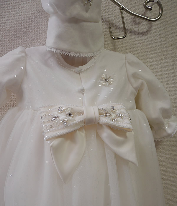 ふわふわウェディングドレスをベビードレスにリメイクしました。