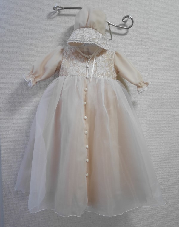 オフホワイトのオーガンジーが重なった優しい色合いのドレスです。