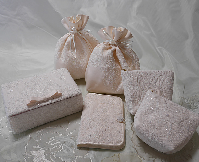 ウェディングドレスをアクセサリーボックスやポーチなどにリメイクしました。