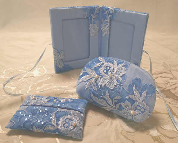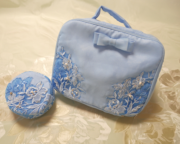 染めた生地とレースを使ってインナーケースやポーチ、フォトスタンド等も