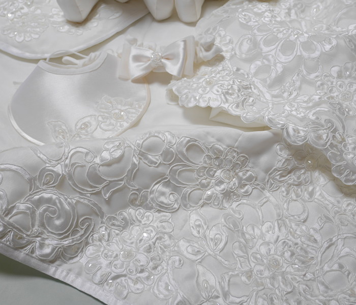 おくるみやスタイ、ベビーヘッドリボンのお宮参りセットです。