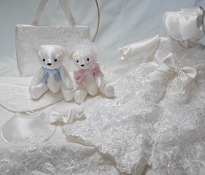 おくるみやスタイ、ベビーヘッドリボンのお宮参りセットです。