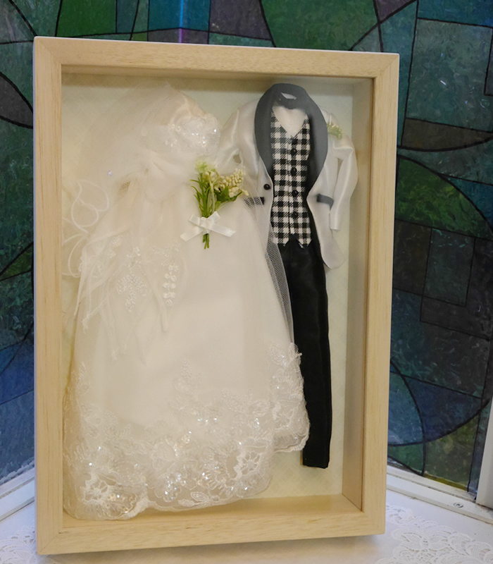 ウェディングドレスをフレーム型のミニチュアドレスにリメイクしました。