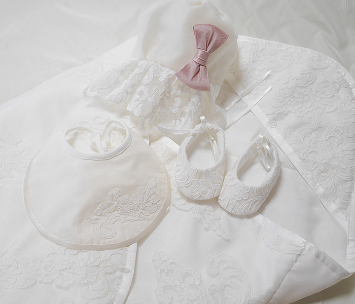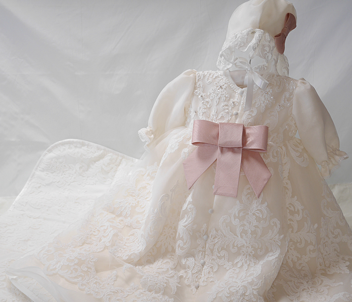 アイボリーのサテンにエレガントなレースがのったドレスは