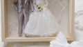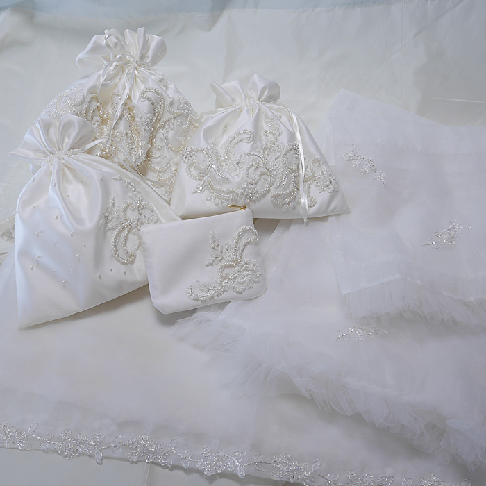 ウェディングドレスからポーチとカフェカーテンにリメイクしました。