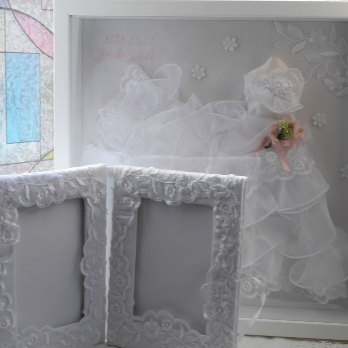 ウェディングドレスをミニチュアドレスのフレームとフォトフレームにリメイクしました。
