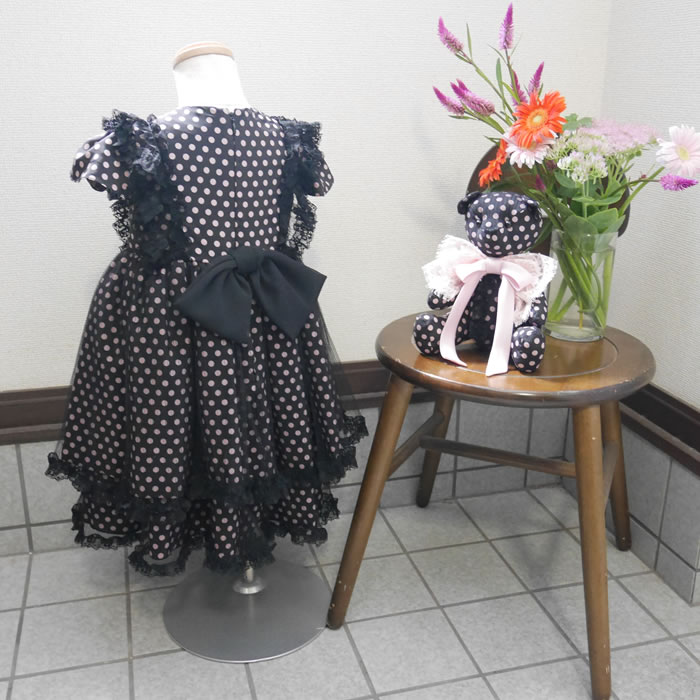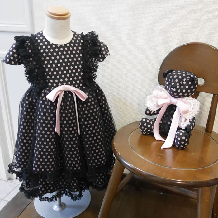 お出かけが楽しみのピンクとブラックの水玉模様の可愛いドレスですね。