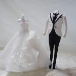 アイボリードレスにピンクがかったレースのウェディングドレスから