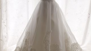 下のアイボリーサテンがオフホワイトのチュールを何枚も重ねた