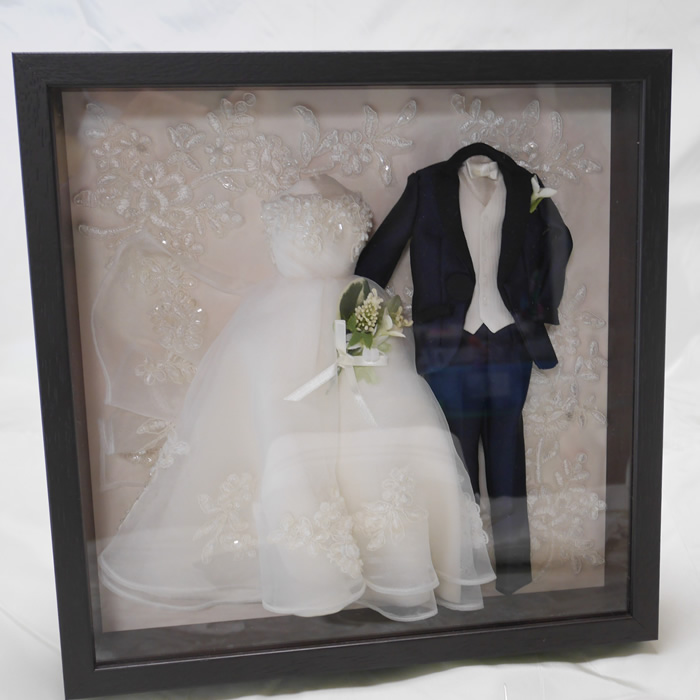 ウェディングドレスとタキシードでフレーム型のミニチュアドレスや