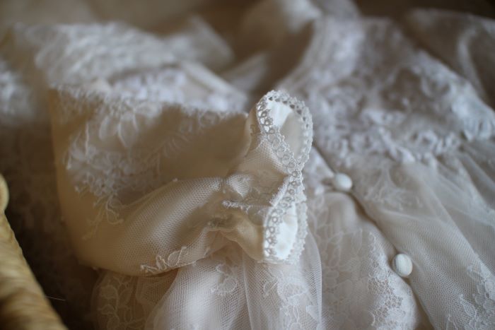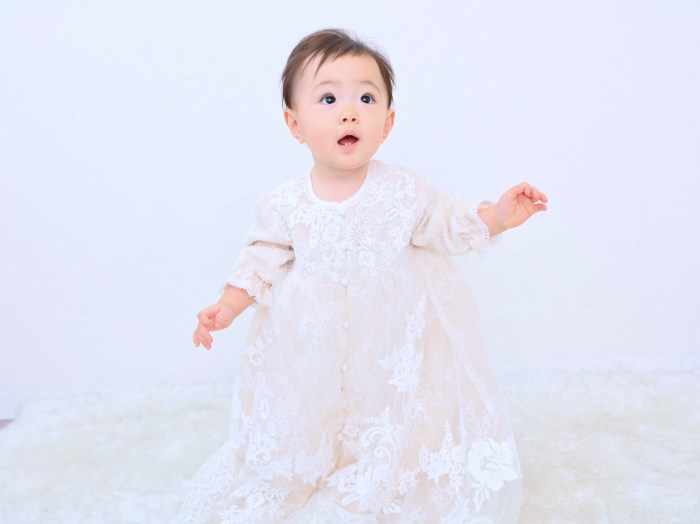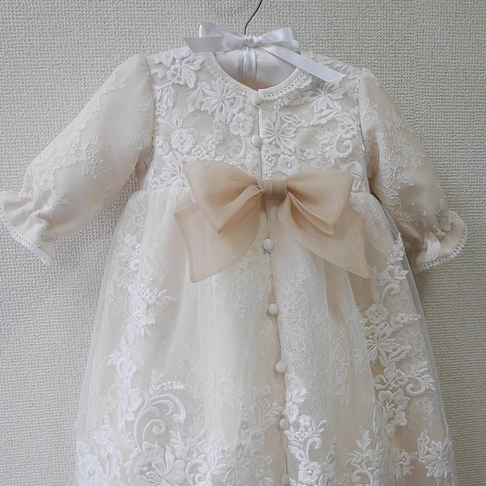 オフホワイトの2種類のレースが重なった優しいい色合いのベビードレスです。