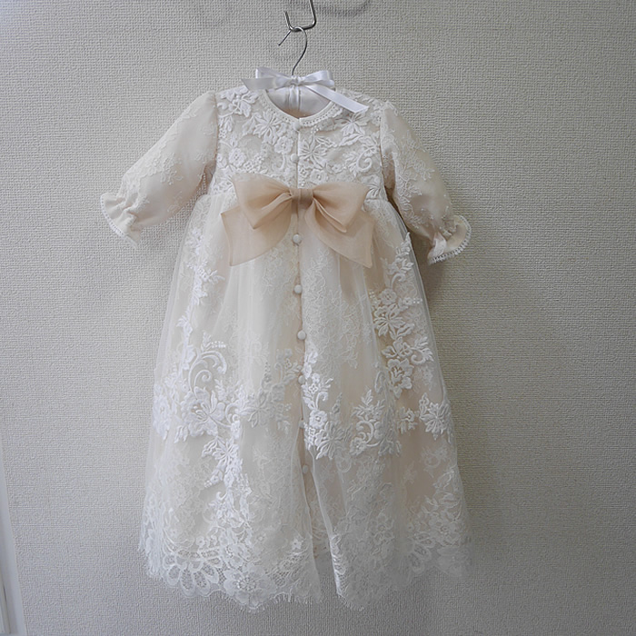 オフホワイトの2種類のレースが重なった優しいい色合いのベビードレスです。