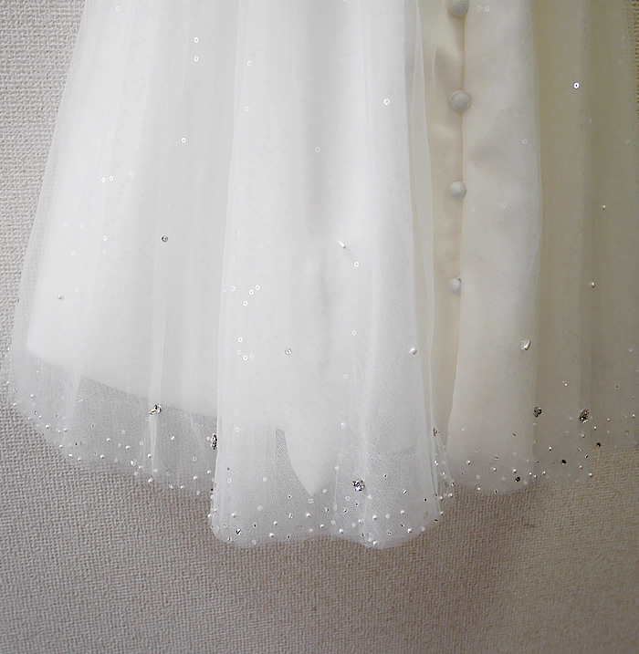 ドレスのスパンコール付きのチュールの上にベールのビジューを裾にあしらい,