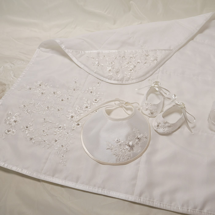 おくるみやスタイは銀糸が施されたレースをあしらった上品なデザインです。