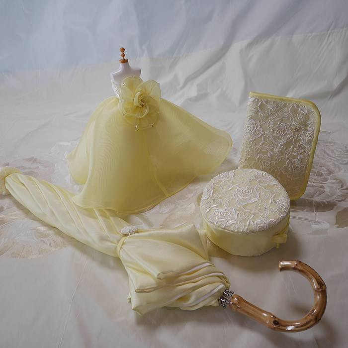 レモンイエローの爽やかなカラードレスを小物達にリメイクしました。