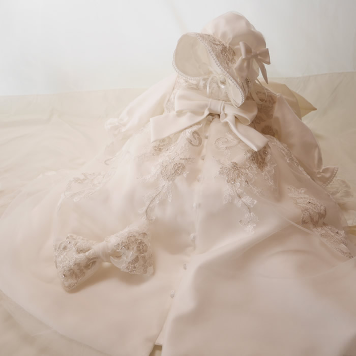 ウェディングドレスからベビードレスとヘッドリボンにリメイクしました。