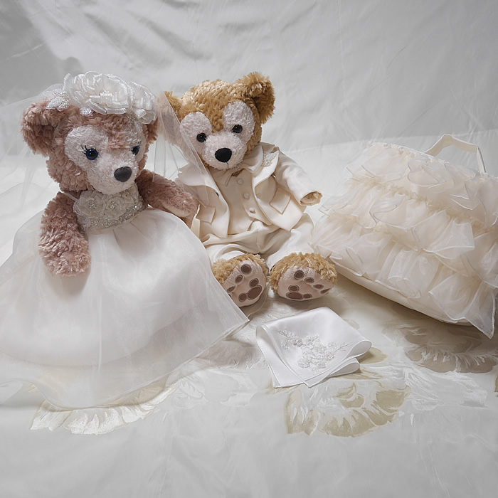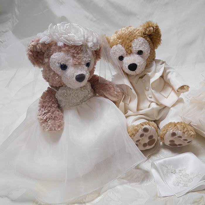 ウェディングドレスからダッフィーとシェリーメイのタキシード&ドレスを作りました。