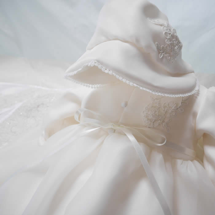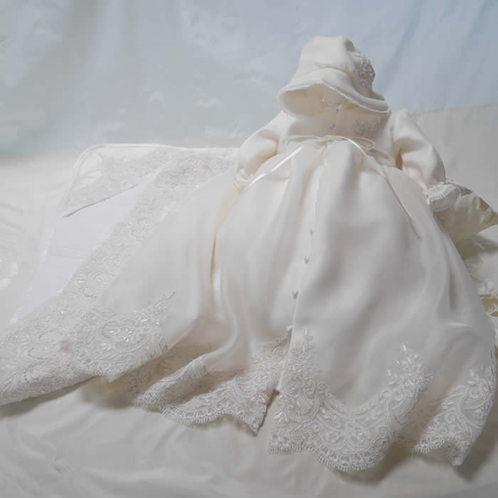 ウェディングドレスからベビードレスとおくるみにリメイクしました。