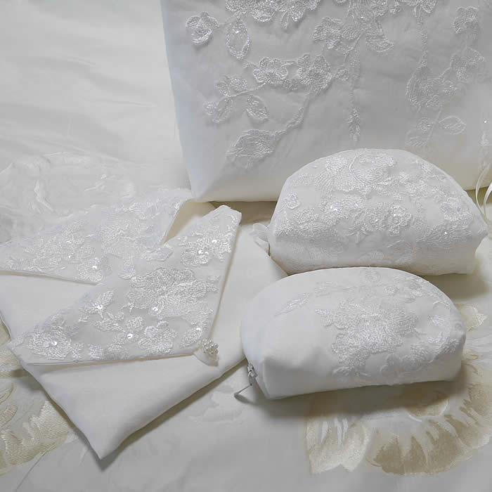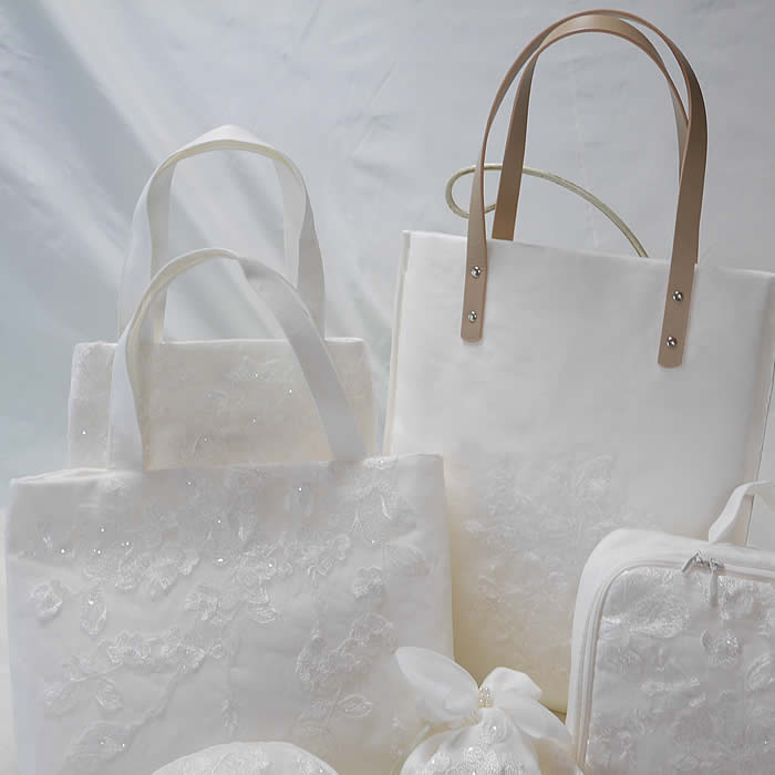 ウェディングドレスからたくさんのポーチやバッグにリメイクしました。