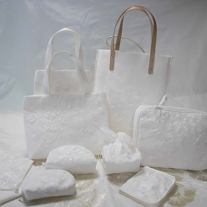 ウェディングドレスからたくさんのポーチやバッグにリメイクしました。