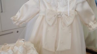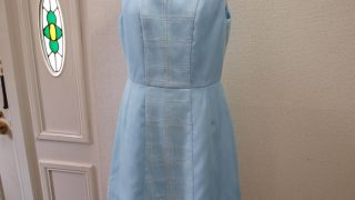 長かったスカート丈を歩ける丈にカットし、後ろはリボンで結んでサイズ調節します。