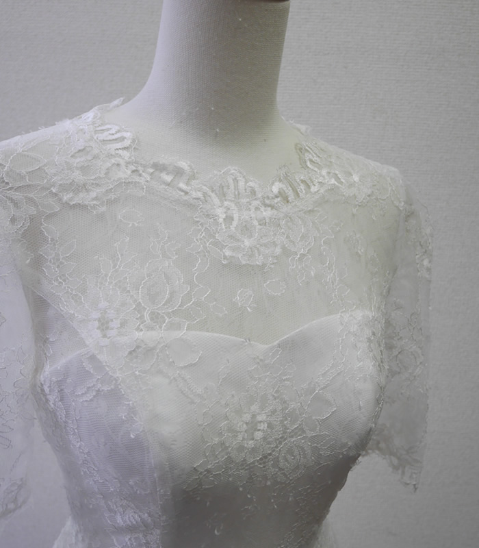 ウェディングドレスはカチッとしたスタンドカラーをラウンドネックに、