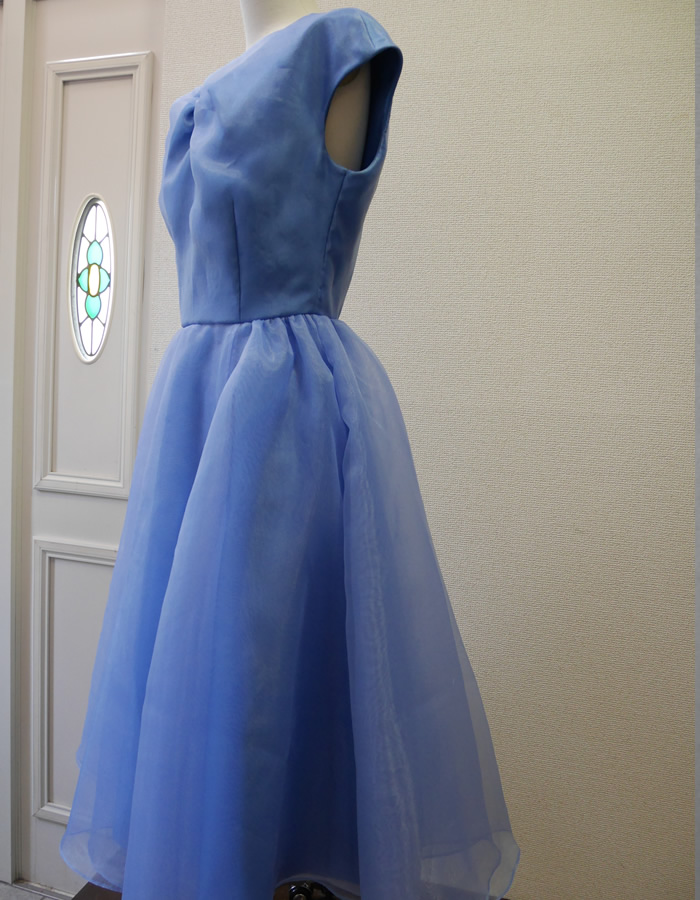 カラードレスは露出を抑えたフレンチスリーブタイプのフレアースカートです。