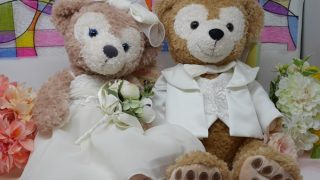 インテリアパペットのダッフィーとシェリーメイのウェディングドレスとタキシードです。
