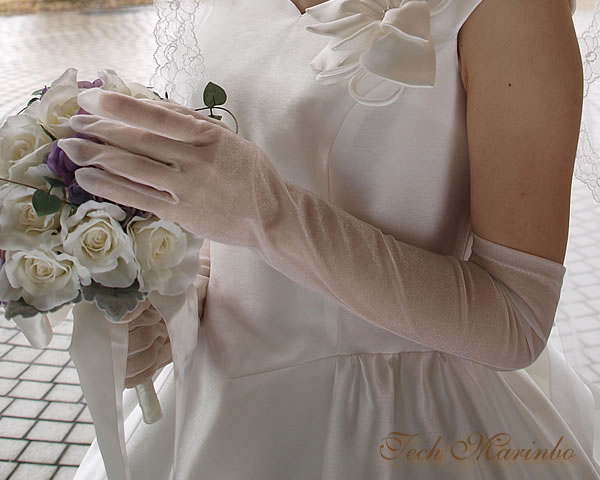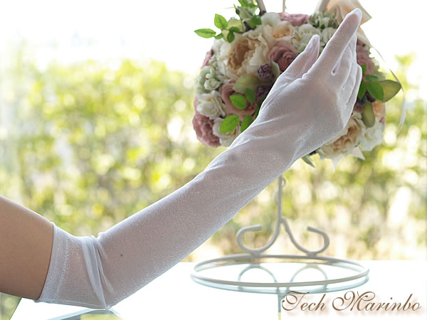 ストレッチ性の高い上質なオーガンジーが手にぴったりとフィットする肘上丈のウエディンググローブです。
