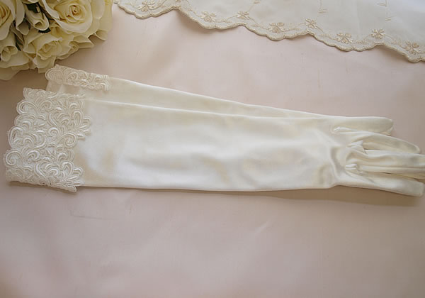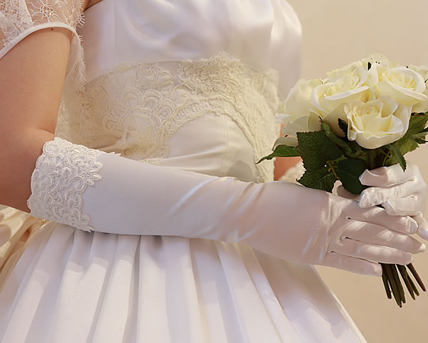 上品な光沢と適度なストレッチ性でドレス姿がグレードアップする肘下のサテンロンググローブです。