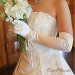上品な光沢と適度なストレッチ性でドレス姿がグレードアップする肘上のサテングローブ。