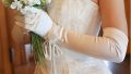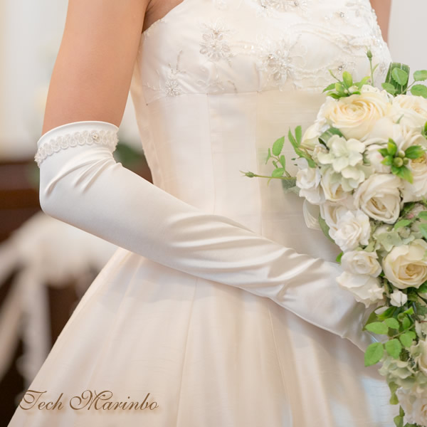 上品な光沢と適度なストレッチ性でドレス姿がグレードアップする肘上のサテングローブ。
