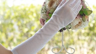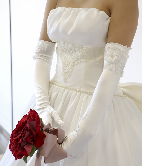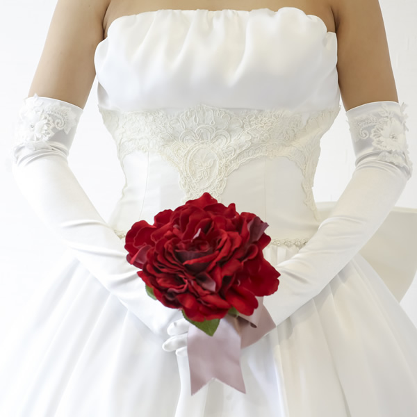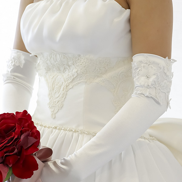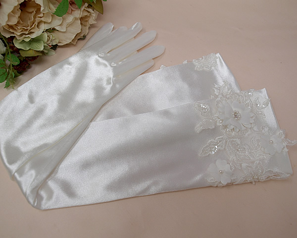 袖口に立体的なお花のモチーフをあしらった華やかなサテングローブ。